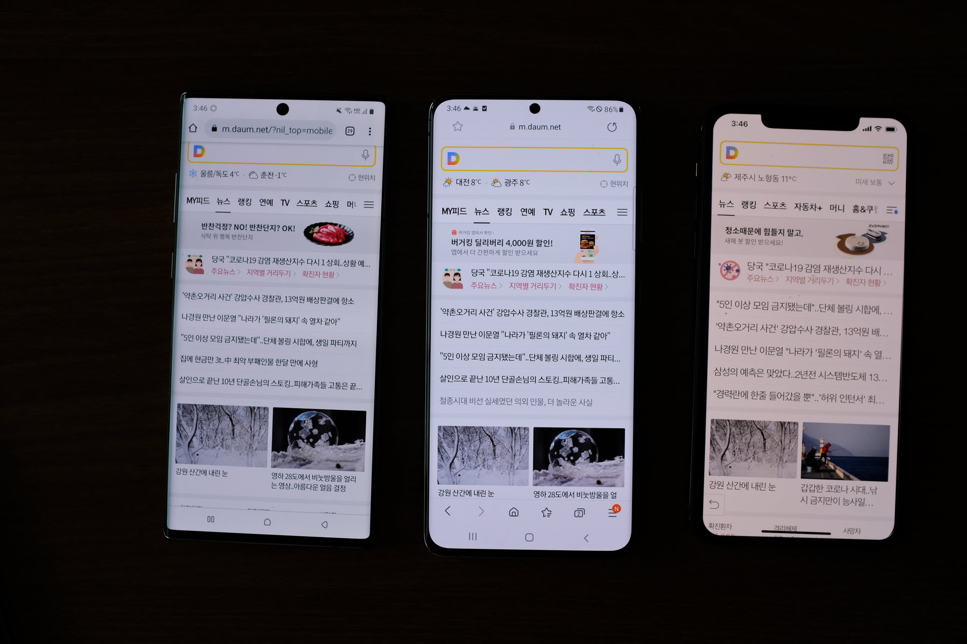 상단이 S21 울트라 중간이 노트10 그리고 마지막은 아이폰 11 프로 맥스입니다.
